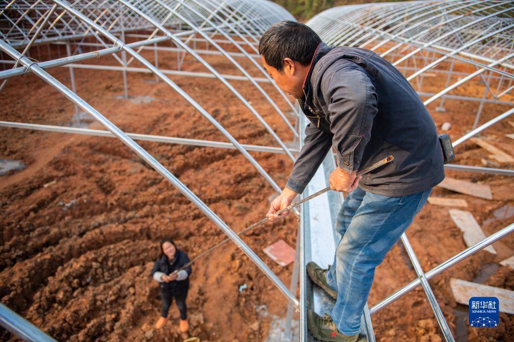 2月21日,在醴陵市東富鎮東富村,村民在搭建育秧大棚。