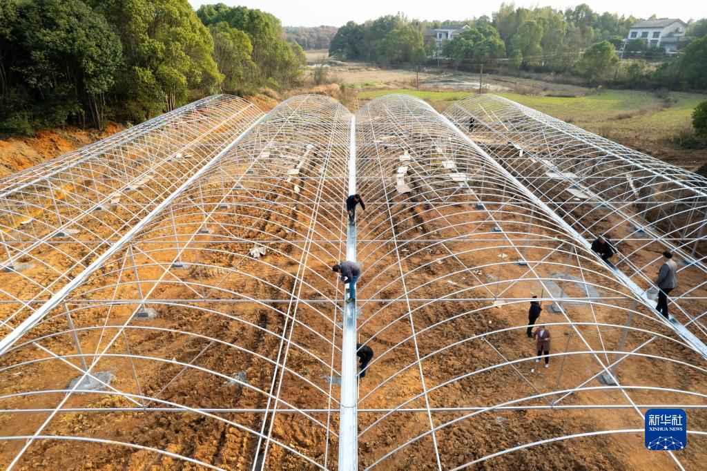 2月21日,在醴陵市東富鎮東富村,村民在搭建育秧大棚(無(wú)人機照片)。