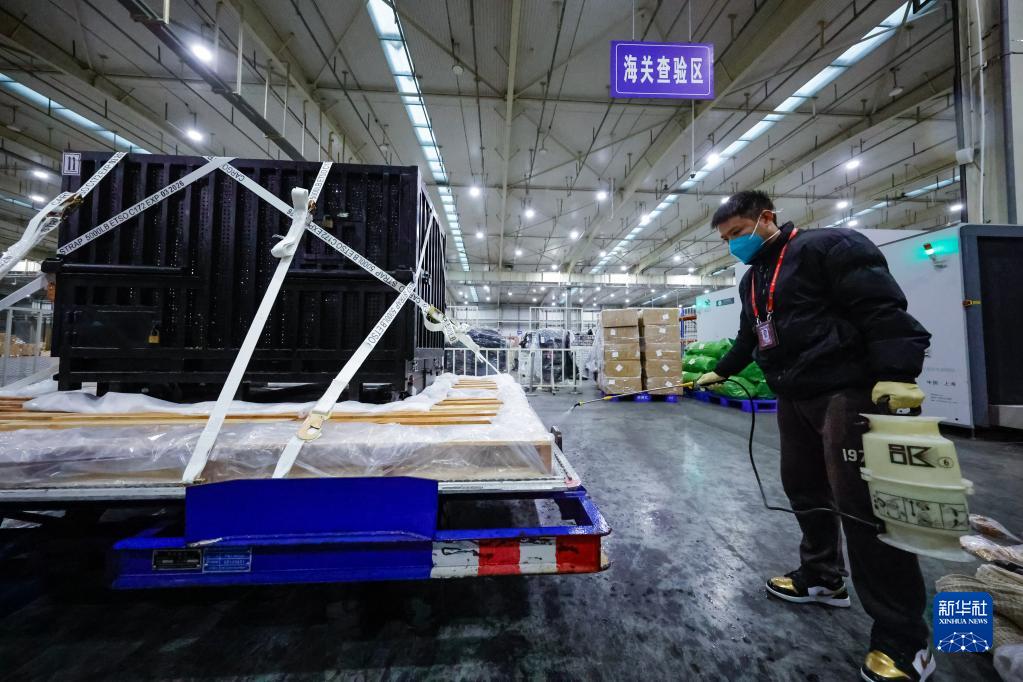 2月21日,大熊貓“香香”抵達成都雙流國際機場(chǎng)海關(guān)查驗區,工作人員對裝載“香香”的車(chē)輛消毒。