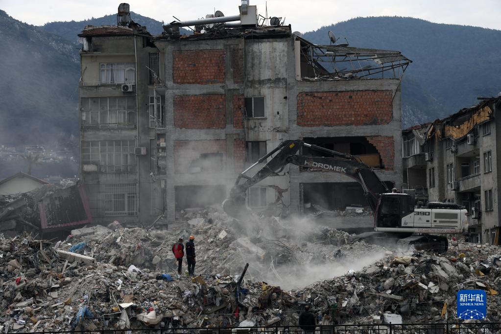 2月21日,工作人員利用大型機械在土耳其哈塔伊省清理廢墟。