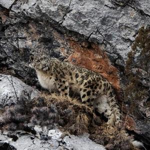2月21日,在青海省玉樹(shù)藏族自治州雜多縣昂賽鄉境內的昂賽大峽谷內,一只雪豹在向上攀爬。