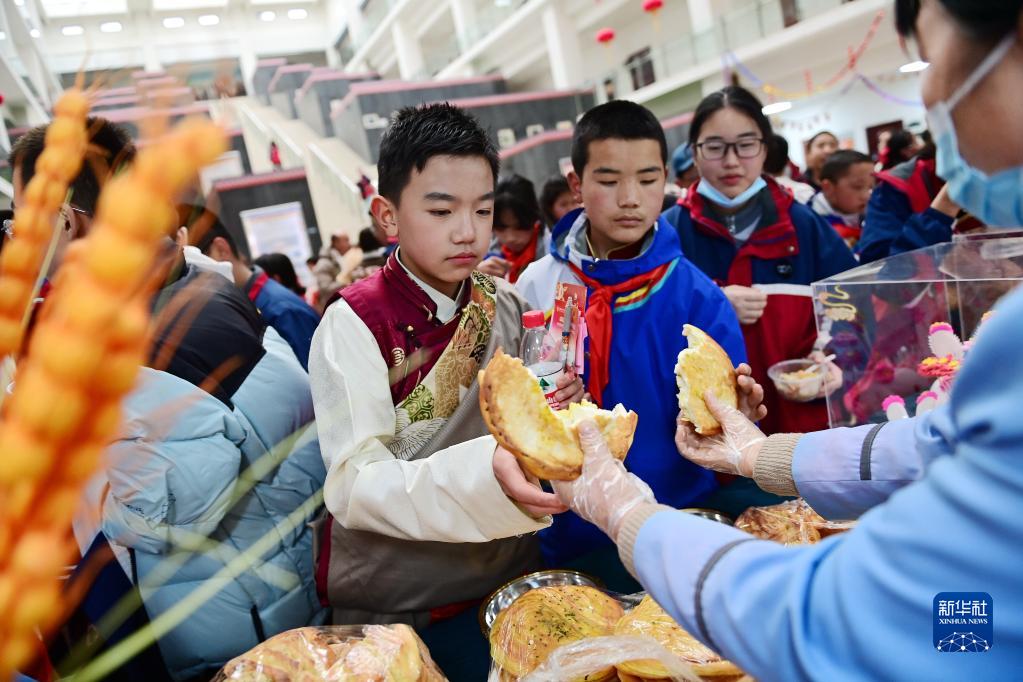 2月21日,在西安市浐灞第一中學(xué)舉行的藏歷新年團拜活動(dòng)上,漢藏學(xué)生品嘗特色小吃。