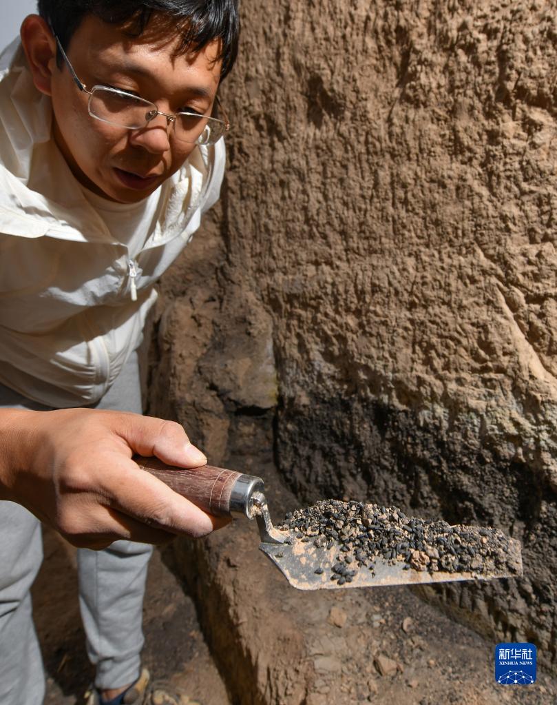 在甘肅慶陽(yáng)市南佐新石器時(shí)代遺址核心區大型宮殿建筑發(fā)掘現場(chǎng),考古隊員展示炭化水稻遺存(2022年8月23日攝)。