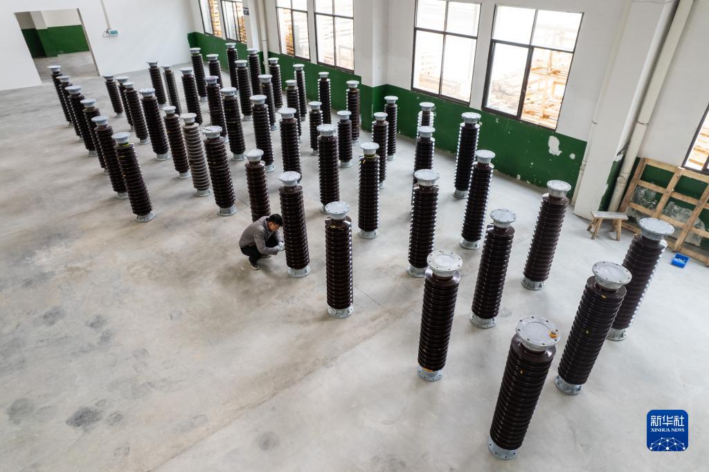 2月22日,在位于醴陵市的湖南陽(yáng)東電瓷電氣股份有限公司生產(chǎn)車(chē)間,工作人員在檢查瓷絕緣子質(zhì)量(無(wú)人機照片)。