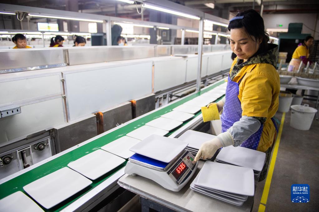 2月22日,在醴陵陶潤實(shí)業(yè)發(fā)展有限公司生產(chǎn)車(chē)間,工作人員給生產(chǎn)的瓷器稱(chēng)重并檢查瓷器品質(zhì)。