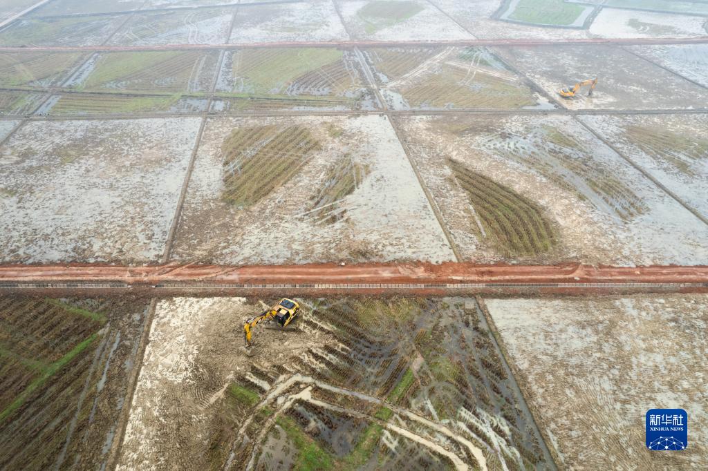 2月9日,在益陽(yáng)市赫山區筆架山鄉中塘村,村民進(jìn)行高標準農田建設施工(無(wú)人機照片)。新華社記者 陳思汗 攝