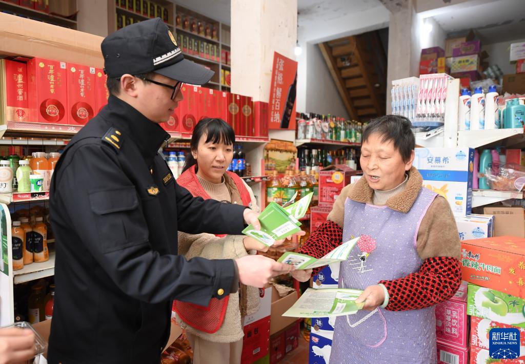 2月22日,在八里店鎮西山社區,黨員志愿者和行政執法隊員向沿街商戶(hù)發(fā)放垃圾分類(lèi)、沿街清運的告知單。