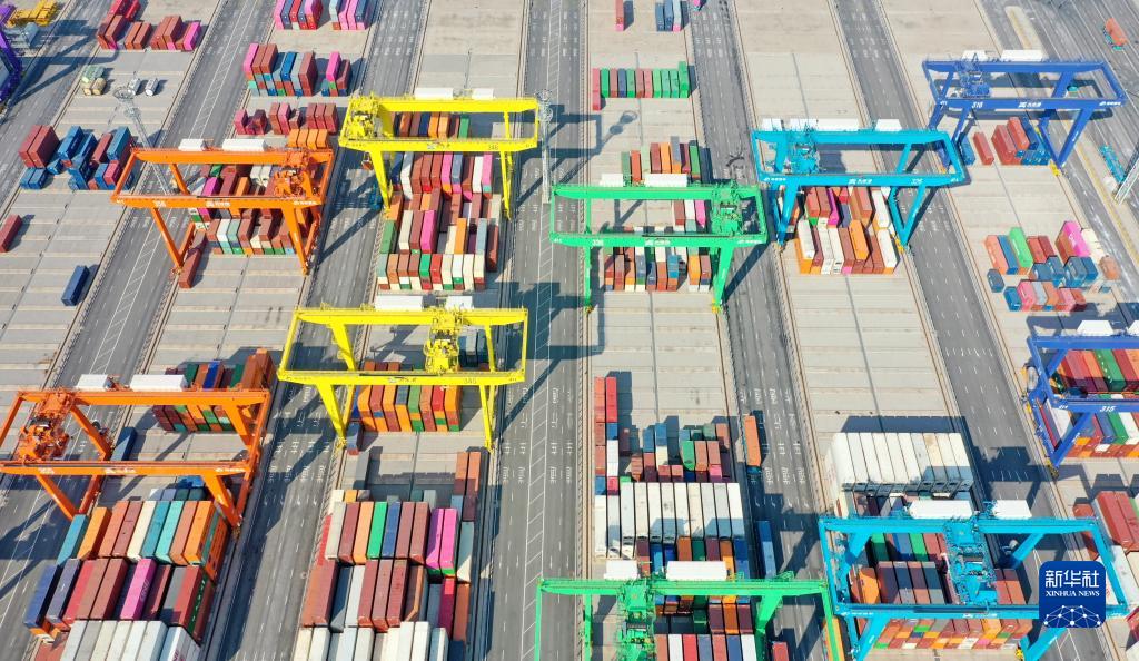 在天津港全物聯(lián)網(wǎng)集裝箱碼頭,場(chǎng)橋在堆場(chǎng)內吊運集裝箱(無(wú)人機照片,2月21日攝)。