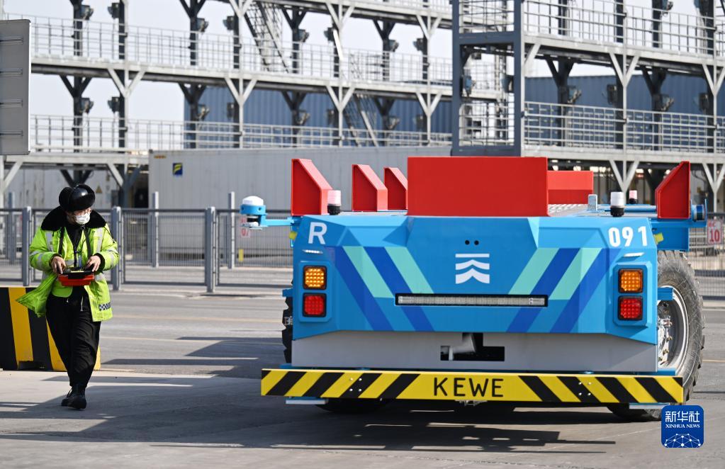 工作人員在天津港全物聯(lián)網(wǎng)集裝箱碼頭調試智能水平運輸機器人(2月21日攝)。