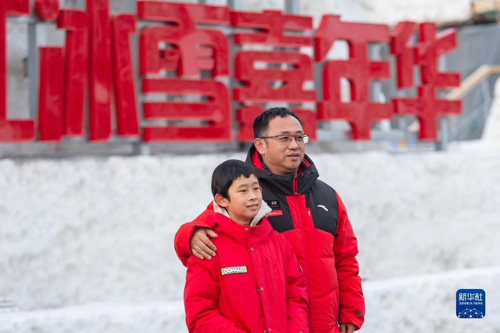 2月22日,游客在哈爾濱松花江冰雪嘉年華入口處拍照留念。