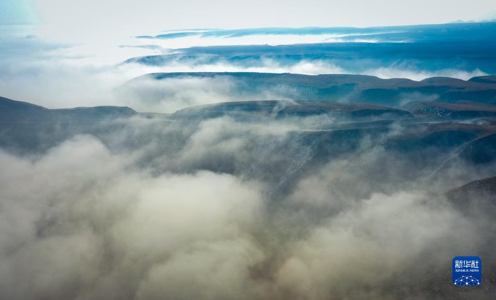 當日,寧夏吳忠市同心縣的山谷間出現云海景觀(guān),農田、旱塬、公路在霧中若隱若現,景色壯美。