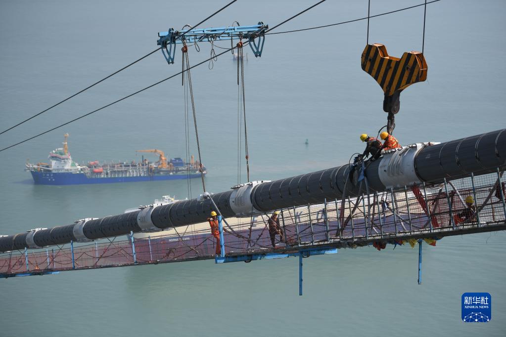 2月22日,工人在深中通道伶仃洋大橋海上施工貓道及主纜上開(kāi)展作業(yè)。