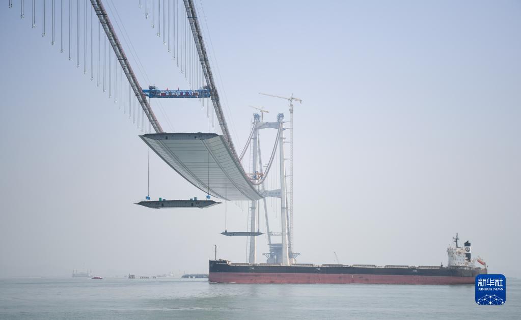 2月22日,貨輪通過(guò)正在吊裝鋼箱梁的深中通道伶仃洋大橋。