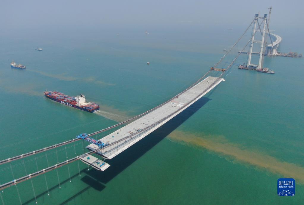 2月22日,集裝箱貨輪通過(guò)正在吊裝鋼箱梁的深中通道伶仃洋大橋(無(wú)人機照片)。