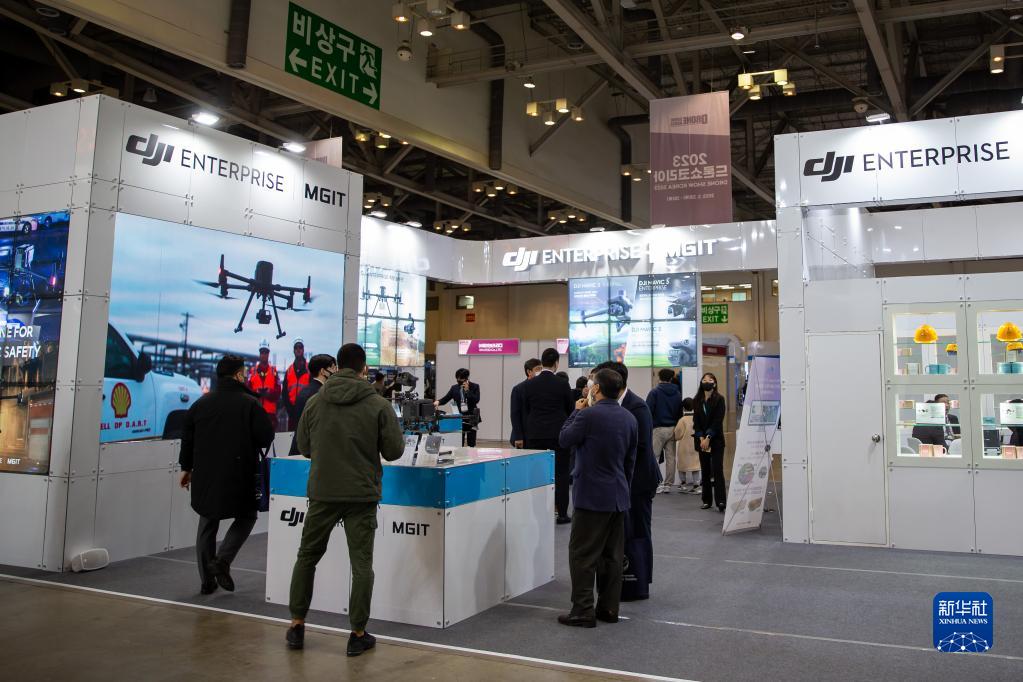 2月23日,參觀(guān)者在韓國釜山舉辦的2023韓國無(wú)人機展大疆展位參觀(guān)。