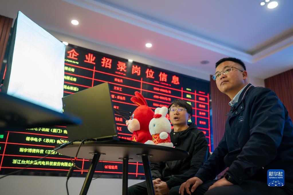 在云南省曲靖市麒麟區人力資源服務(wù)產(chǎn)業(yè)園,袁海波(右)通過(guò)網(wǎng)絡(luò )直播介紹就業(yè)崗位并宣傳就業(yè)服務(wù)政策(2月11日攝)。
