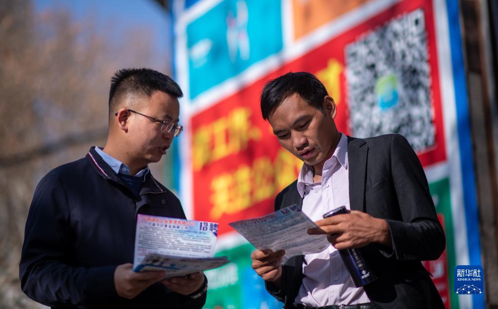 在云南省曲靖市,袁海波(左)在人才市場(chǎng)向務(wù)工人員發(fā)放就業(yè)宣傳單并介紹就業(yè)政策(2月12日攝)。