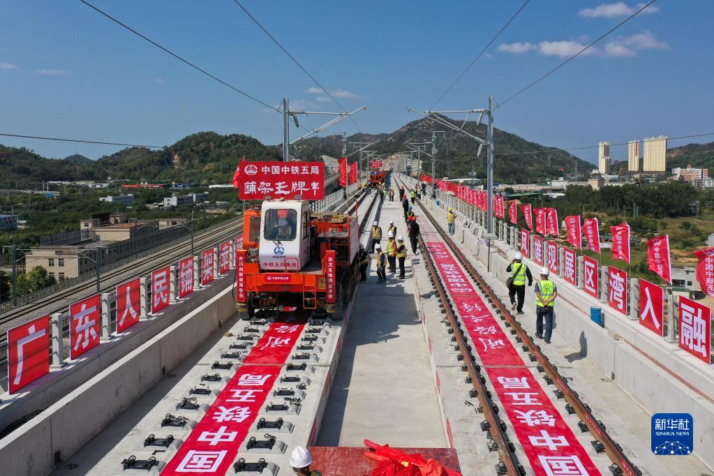 當日,中鐵五局承建的廣汕鐵路正線(xiàn)最后一組500米長(cháng)軌在汕尾東沖特大橋鋪設完成,該線(xiàn)正線(xiàn)鋪軌實(shí)現貫通。廣汕鐵路是“軌道上的大灣區”高鐵骨干網(wǎng)重要組成部分,該線(xiàn)全長(cháng)202公里,時(shí)速350公里,途經(jīng)廣州、惠州、深汕特別合作區、汕尾。全線(xiàn)通車(chē)后,廣州到汕尾運行時(shí)間將縮短至1小時(shí)以?xún)取?/p>
