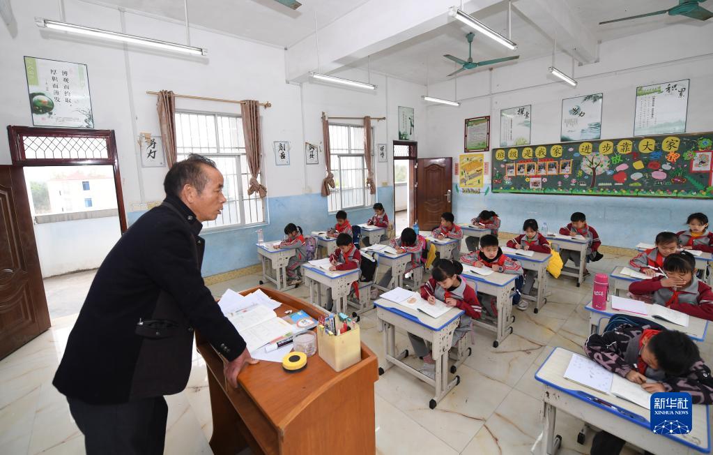 在廣西賓陽(yáng)縣王靈鎮中心學(xué)校七新教學(xué)點(diǎn),王英紅老師在給學(xué)生上課(2月22日攝)。