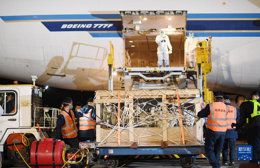 銀川海關(guān)及銀川河東國際機場(chǎng)工作人員對種羊進(jìn)行檢疫、消殺、轉運(2月22日攝)。