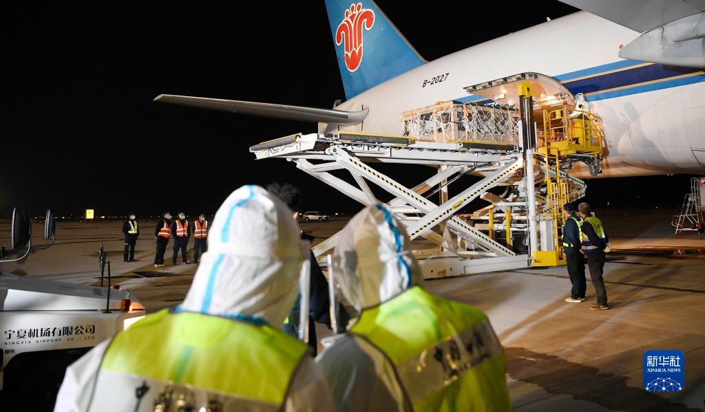 銀川海關(guān)及銀川河東國際機場(chǎng)工作人員對種羊進(jìn)行檢疫、消殺、轉運(2月22日攝)。