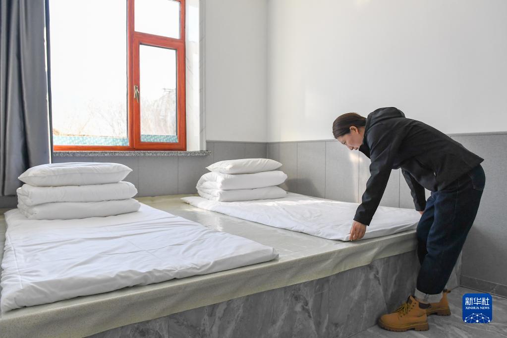 2月22日,吉林市永吉縣北大湖鎮南溝村一家民宿負責人孫云霞在整理床鋪。