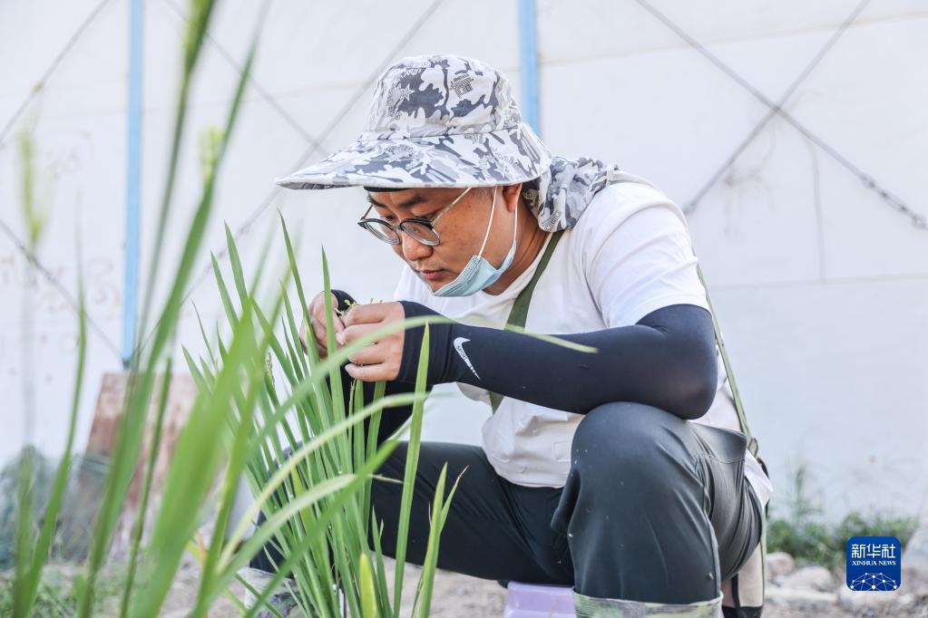 2月22日,青島海水稻研究發(fā)展中心的科研人員在海南三亞的國家南繁科研育種基地里做水稻雜交實(shí)驗。