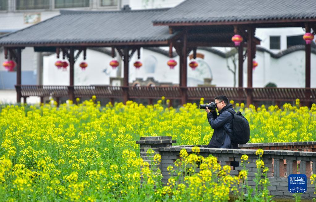 2月19日,游客在四川省廣安市花橋鎮竹林村盛開(kāi)的油菜花旁拍照。