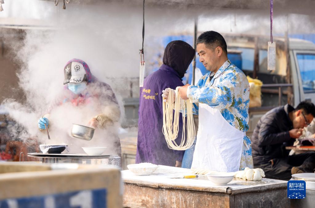 2月23日,河北省唐山市豐南區大新莊鎮大集的商販在制作拉面。