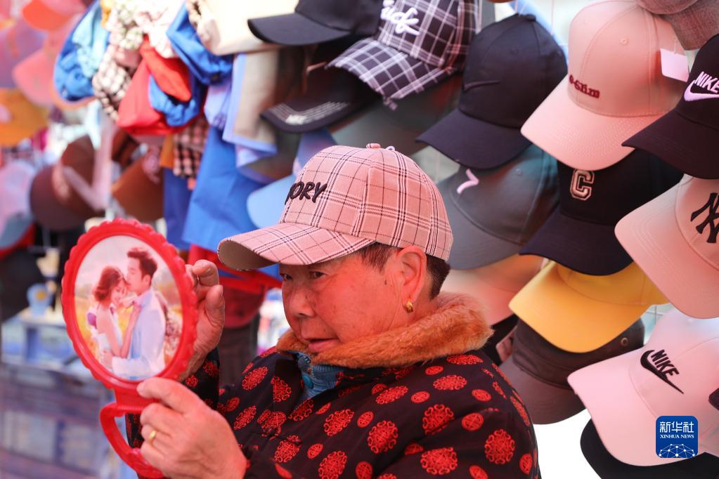 2月23日,一名婦女在河南省焦作市溫縣番田鎮楊磊村集市上挑選帽子。