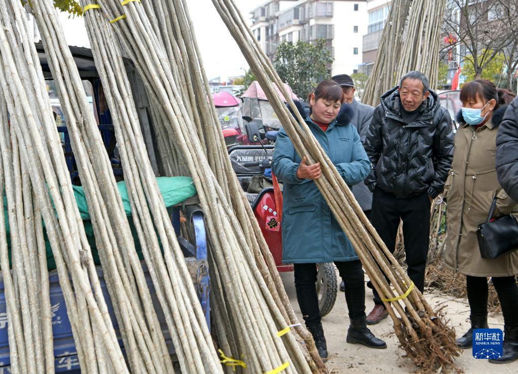 2月22日,安徽省淮南市壽縣堰口鎮江黃村村民在鄉村集市上選購樹(shù)木。