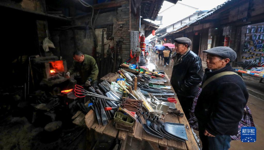 2月23日,在四川省瀘州市江陽(yáng)區分水嶺鎮,村民在集市的鐵匠鋪加工農機配件。
