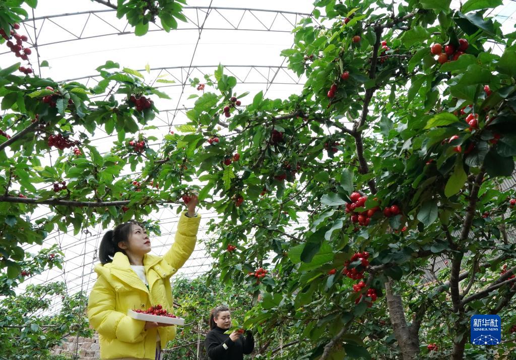 2月23日,游客在秦皇島市山海關(guān)區石河鎮一大棚內采摘櫻桃。