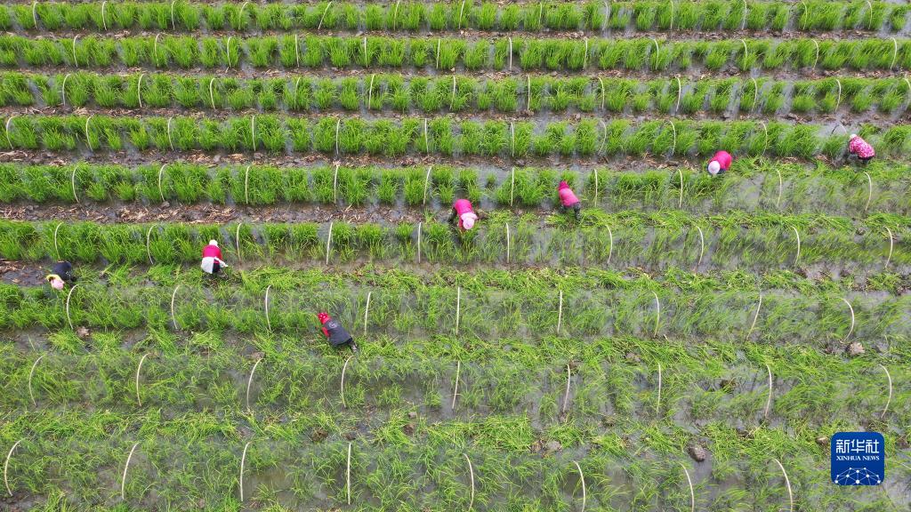 2月23日,浙江省溫嶺市新河鎮高橋頭村農民進(jìn)行茭白秧苗春季管理(無(wú)人機照片)。