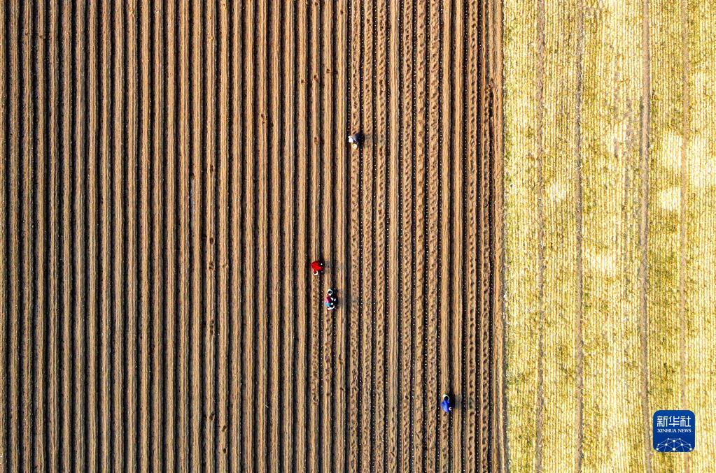 2月24日,山東省臨沂市平邑縣地方鎮東家莊村村民在田間勞作(無(wú)人機照片)。