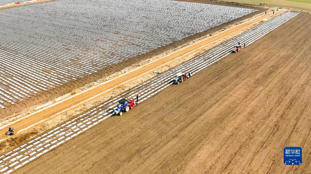 2月24日,山東省青島市即墨區藍村街道辛城村農民利用馬鈴薯播種機播種早茬馬鈴薯(無(wú)人機照片)。