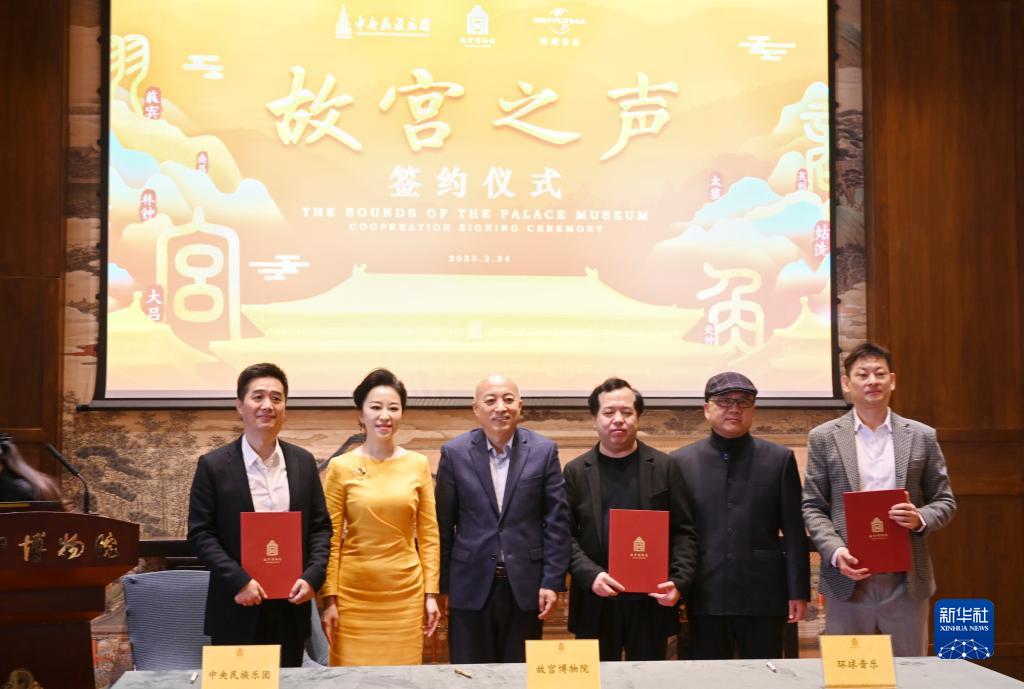 2月24日,故宮博物院院長(cháng)王旭東(左三)、中央民族樂(lè )團團長(cháng)趙聰(左二)等嘉賓在項目簽約儀式上。