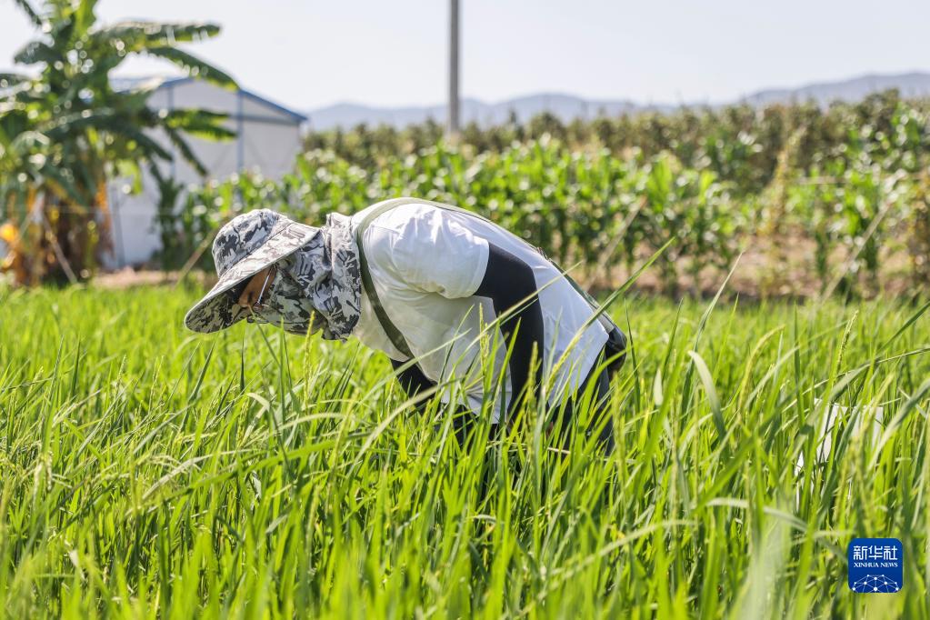 2月22日,青島海水稻研究發(fā)展中心的科研人員殷會(huì )德在三亞的國家南繁科研育種基地里觀(guān)察水稻的長(cháng)勢。