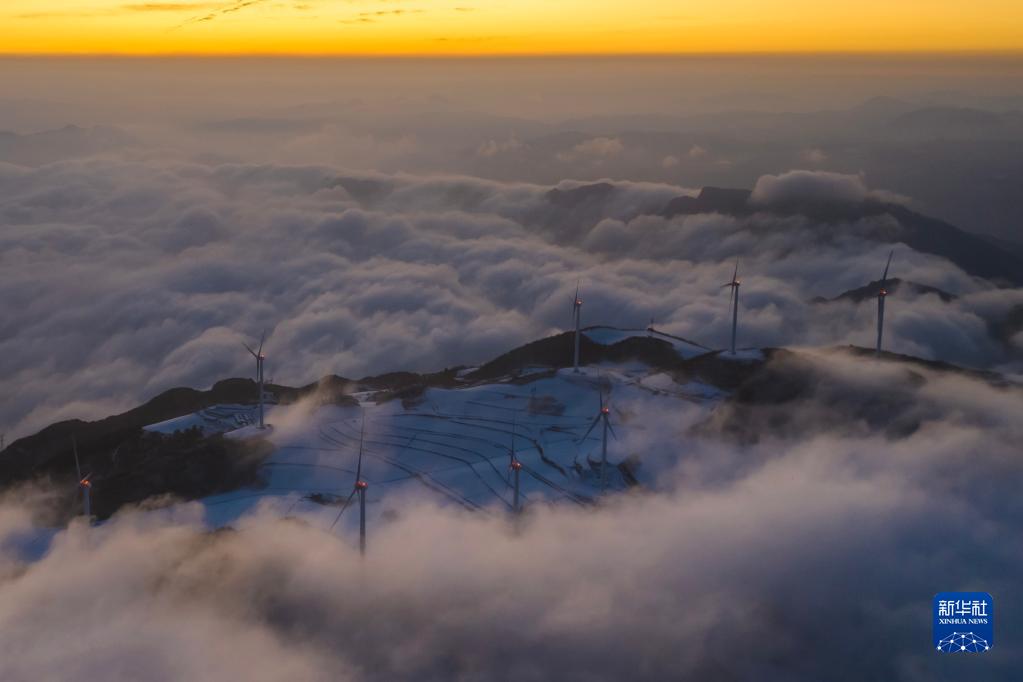一場(chǎng)春雪過(guò)后,湖北省宜昌市秭歸縣云臺荒風(fēng)力發(fā)電場(chǎng)銀裝素裹,風(fēng)電機組在云海中旋轉,美景如畫(huà)。