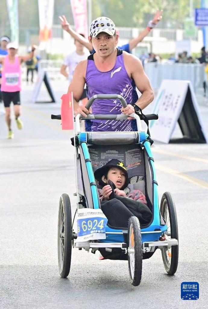 羅書(shū)堅推著(zhù)兒子小柏參加浙江建德新安江馬拉松賽(2022年11月6日攝)。