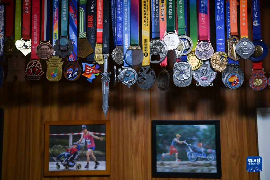 在小柏房間門(mén)口的墻上,掛著(zhù)父子倆參賽的紀念獎牌及照片(2月23日攝)。