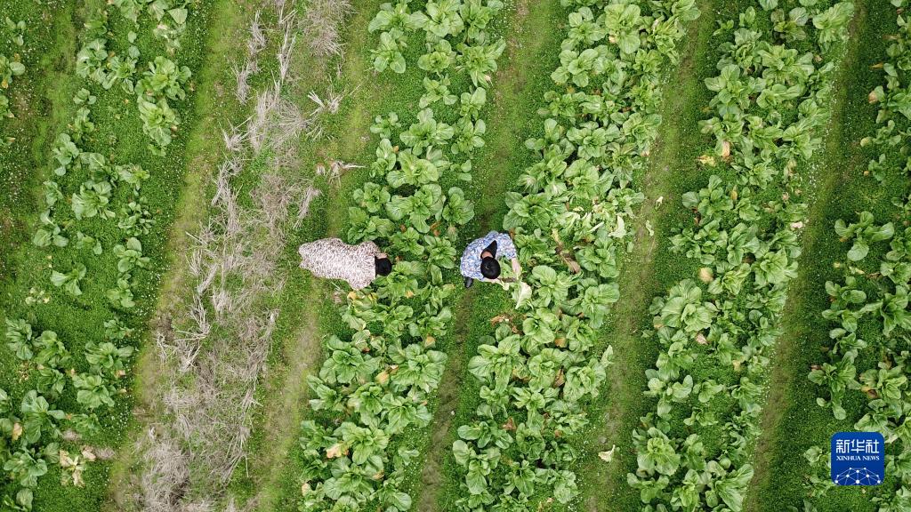 2月24日,在瀏陽(yáng)市小河鄉烏石村,農民在一家預制菜企業(yè)的蔬菜基地里收割芥菜(無(wú)人機照片)。