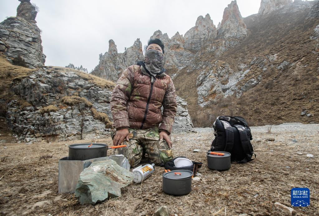 2月21日,更求曲朋在昂賽大峽谷里一邊做飯,一邊查看遠處山上的情況。