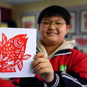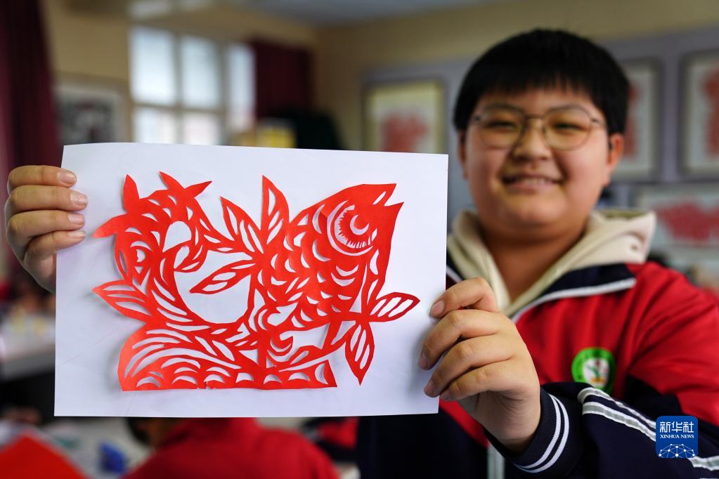 2月24日,河北邢臺經(jīng)濟開(kāi)發(fā)區景家屯小學(xué)學(xué)生展示自己的刻紙作品。