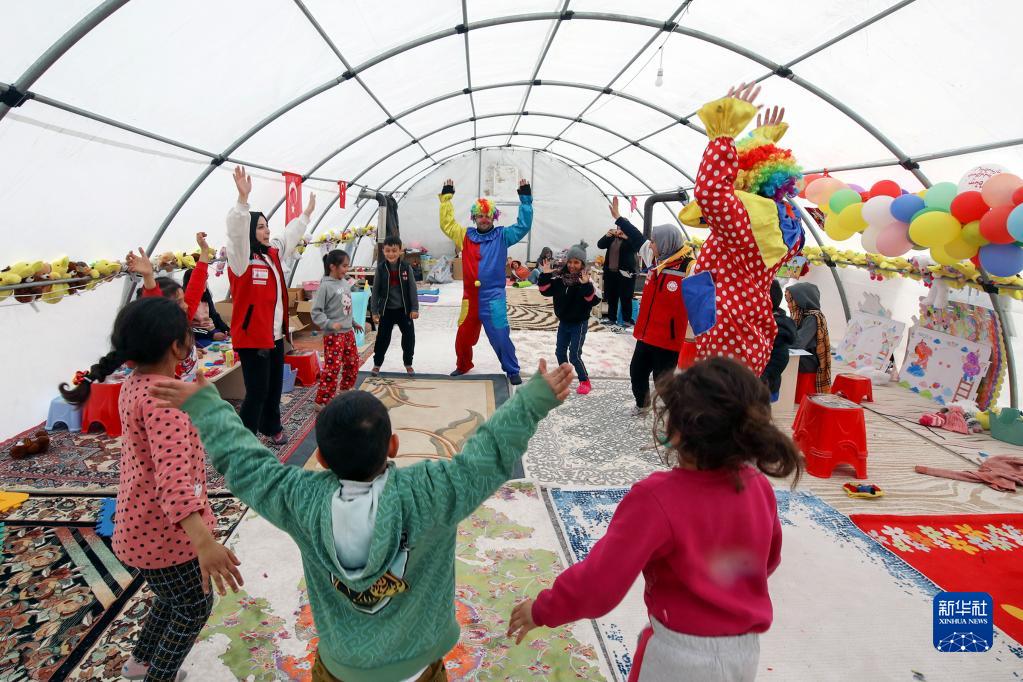 2月19日,在土耳其南部卡赫拉曼馬拉什省卡赫拉曼馬拉什市,孩子們在居民安置點(diǎn)做游戲。
