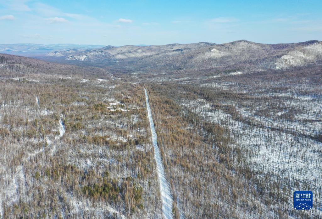 穿越烏龍岱林場(chǎng)的一條林區公路(2月23日攝,無(wú)人機照片)。