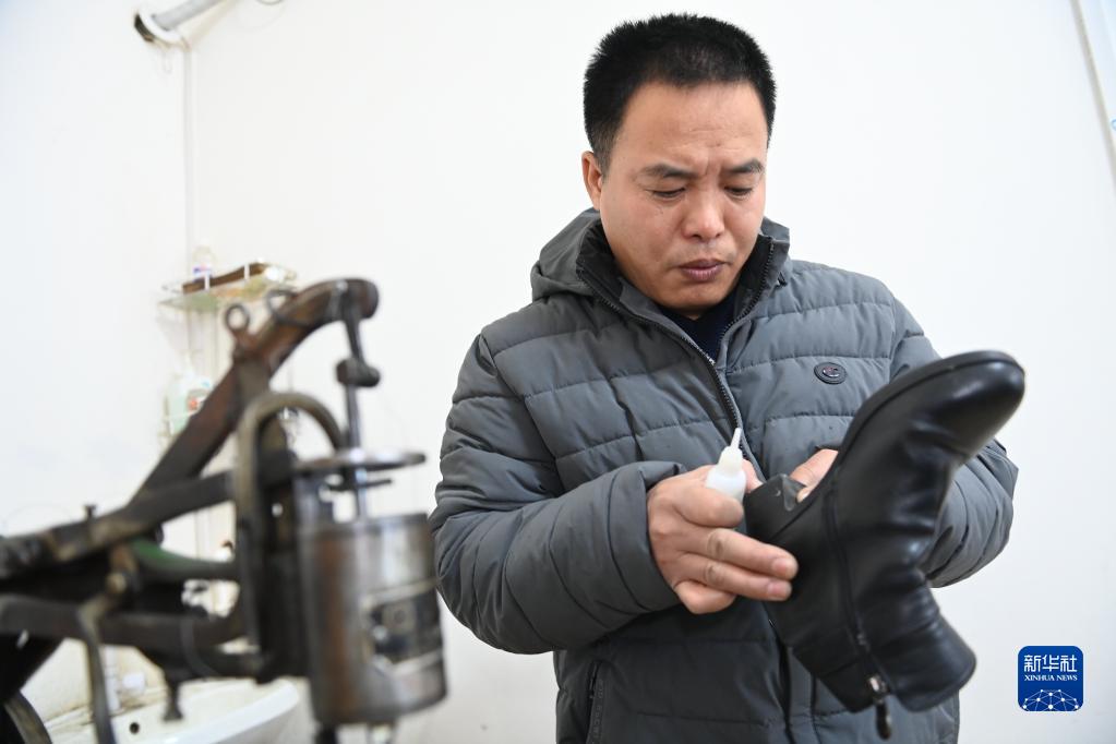 2月23日,在咸陽(yáng)市秦都區錦華社區小濱工坊,殘疾修鞋匠李斌為顧客修補鞋子。