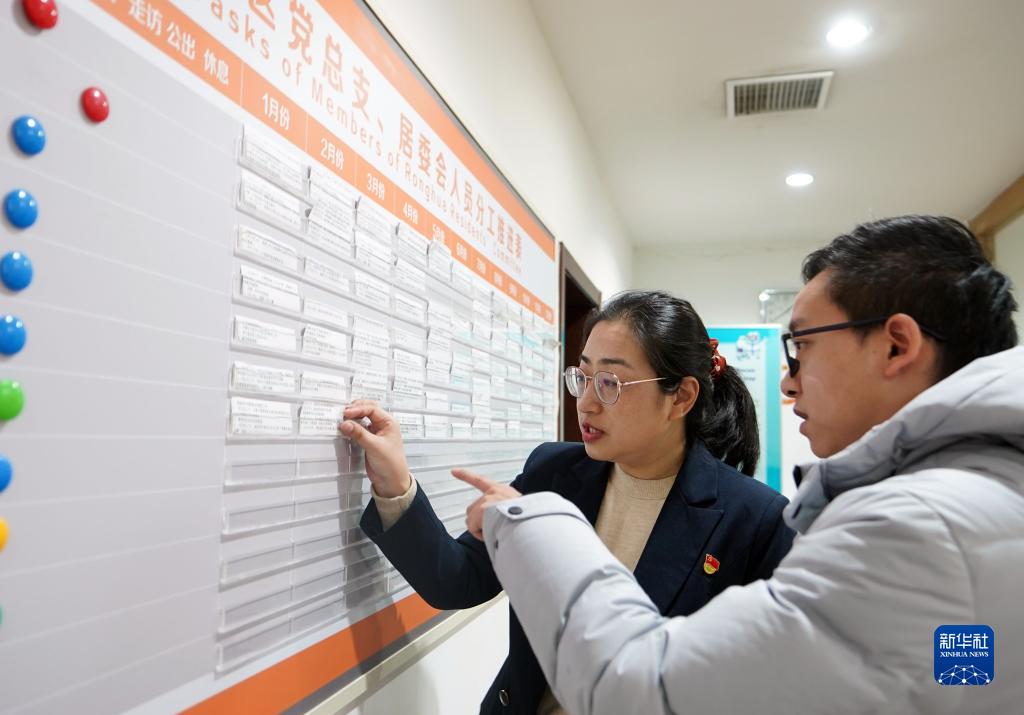 2月16日,在上海虹橋街道榮華居委會(huì ),盛弘(左)和同事安排工作日程。新華社記者 劉穎 攝