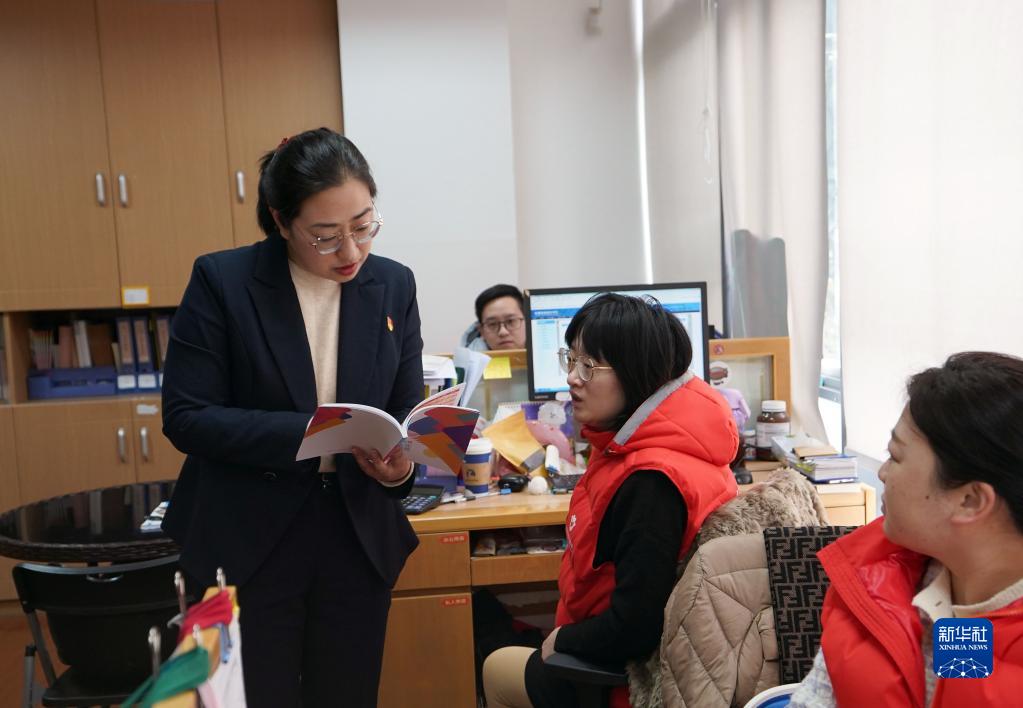 2月16日,在上海虹橋街道榮華居委會(huì ),盛弘(左一)和同事交流活動(dòng)籌備情況。新華社記者 劉穎 攝