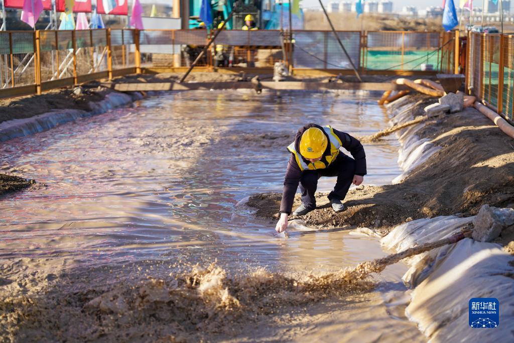 2月25日,中鐵電氣化局的施工人員在雄忻高鐵新蓋房特大橋建設現場(chǎng)對鉆孔泥漿進(jìn)行取樣。